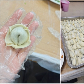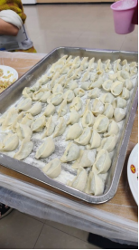 随着一切准备就绪,包饺子活动正式拉开帷幕。桌面上,面团被擀成一张张厚薄均匀的饺子皮,馅料的香气四溢,引得大家食指大动。同学们围坐在桌旁,纷纷亮出自己的“看家本领”。此刻同学们都化身厨艺小能手,有的手法娴熟,捏、挤、压之间,一个个圆润饱满的饺子便成型;有的则是新手“上线”,小心翼翼地放馅、对折、捏边,包出的饺子形态各异,有的像小巧的元宝,有的像鼓鼓的月牙,还有的造型别致,充满创意,惹得大家阵阵欢笑。