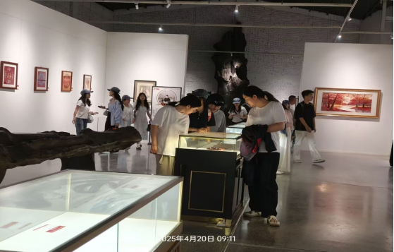 博物馆宽阔的展厅内,陈列着来自省内工美大师的力作,掐丝珐琅精品画、湖北汉绣、印染、织锦、漆器、工艺画、金属工艺品等工美精品技艺高超、琳琅满目。在讲解人员的带领下,同学们或驻足观看展品,或认真聆听讲解,感悟工美文创的魅力。