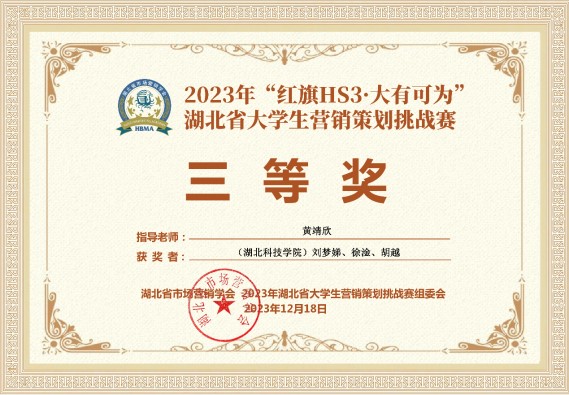 (通讯员:陈鹏 审稿人:王娜)WilliamHill威廉学子在2023年“红旗HS.大有可为”湖北省大学生营销策划挑战赛荣获三等奖、创意视频奖、最佳组织奖及优胜奖等四项大奖,这是继2017年湖北省大学生营销策划挑战赛四项大奖以来,第四次又获四项大奖。