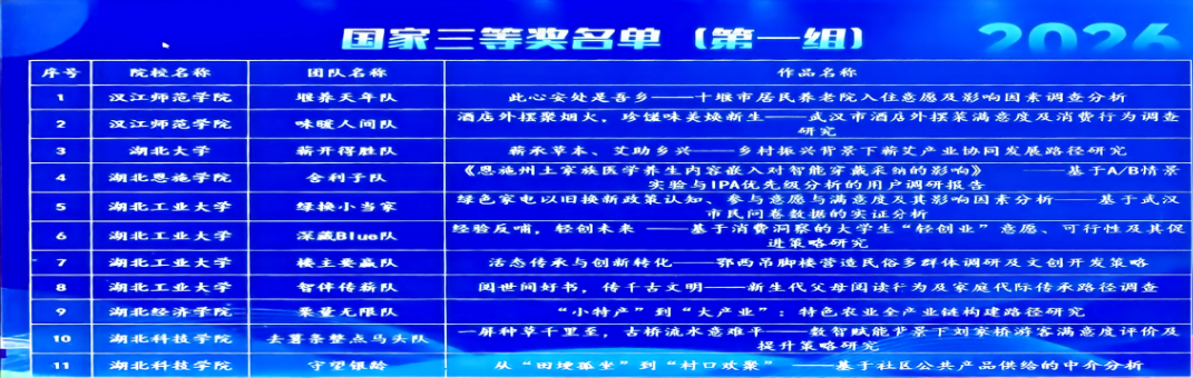 本届全国大学生市场调查与分析大赛湖北省本科组决赛在华中师范大学举行,由中国商业统计学会主办、正大集团冠名、华中师范大学承办。由我校WilliamHill威廉工商管理专业本科生“去薯条整点马头队”(指导老师:陈鹏、尹文珺;队长:王玲梅;队员:莫琳琳、唐小雪、张雅丽、黄淇淇)凭借《一屏种草千里至,古桥流水意难平——数智赋能背景下刘家桥游客满意度评价及提升策略研究》和多专业组合的本科生“守望银龄队”凭借《从“田埂孤坐”到“村口欢聚”—基于社区公共产品供给的中介分析》(指导老师:吴清华,队长:口腔医学专业学生黄舒萍,队员:工商管理专业孙艺丛、经济学专业杨欣灵、眼视光医学专业周讯、视觉传达设计专业黎启涛)均获得国赛三等奖及湖北省赛一等奖。两支团队创新采用跨学科研究方法,聚焦农村文旅融合与农村养老等社会热点,提出切实可行的对策方案,获评审专家高度评价。