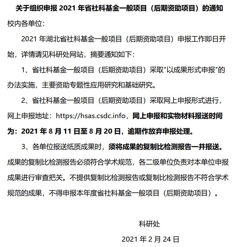 关于组织申报2021年省社科基金一般项目(后期资助项目)的通知
