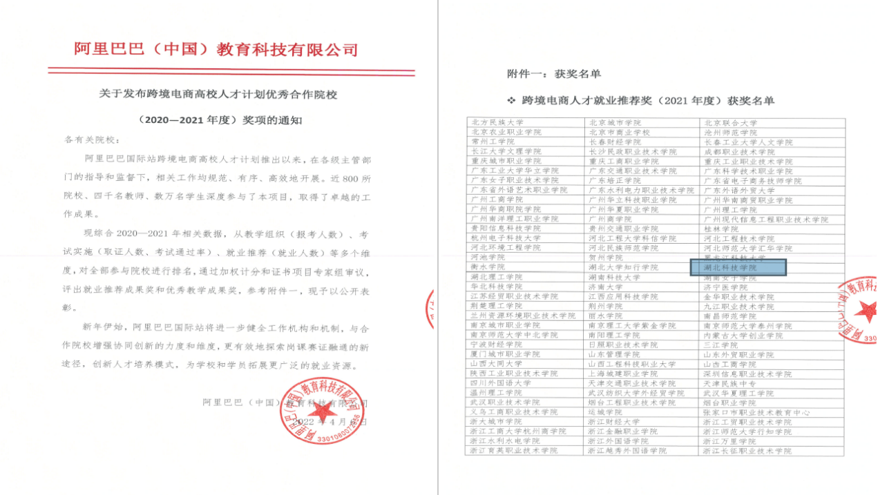 (通讯员:陈雨纷 审稿人:刘波)2022年4月,阿里巴巴(中国)教育科技有限公司公布了《关于发布跨境电商高校人才计划优秀合作院校(2020-2021年度)奖项的通知》,我校被列为“2021年度跨境电商人才就业推荐奖”。本次评审组正是综合2020-2021年教学组织(报考人数)、考试实施(取证人数、考试通过率)、就业推荐(就业人数)等多个维度,对近800所参与院校进行排名,通过加权计分和证书项目专家组审议,最终确定我校获“2021年度跨境电商人才就业推荐奖”。