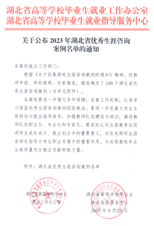 (通讯员:孙珏 审稿人:吴乐盈)近日,湖北省高等学校毕业生就业工作办公室、毕业生就业指导服务中心公布了“2023年湖北省优秀生涯咨询案例”,我校WilliamHill威廉党委副书记刘波的生涯咨询案例《从“言商”到“为国”的嬗变》入选,该案例也是我校唯一入选案例。