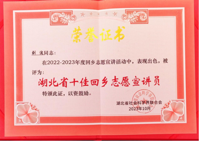 近年来,刘波同志依托回乡探亲访友、带队实践、课题调研等机会,通过专题宣讲、问题探讨、主题党课、现场实践等多种方式积极宣讲党的十九大、二十大、习近平新时代中国特色社会主义思想等精神,用深入浅出、通俗易懂的语言讲清政策和道理,让党的理论飞入寻常百姓中,走入田间地头,取得了可喜的成效和一系列的成绩。如他主持的湖北省社科“是这个理”项目总第54期:《深山里的幸福路》,在湖北电视台综合频道2022年9月24日晚19:58播出,并已上“学习强国”平台,获得超过29.5万的阅读量。2022年带领指导的“洪湖鱼米之乡暑期调研小分队”在“2022年第八届全国大学生暑期实践展示活动”中获得“全国大学生暑期实践成果TOP100”荣誉(中国青年报)。