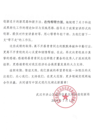 在信中,洪山区经科局高度评价了蔡青青老师的工作表现,并表示这些成绩的取得离不开她的默默奉献和辛勤付出,更离不开我校的关心关爱和倾情帮助。同时,该局也对我校长期以来对洪山区经济社会高质量发展的大力支持表示衷心感谢,并希望未来能够继续加强校地合作,共同推动洪山区的经济社会发展。