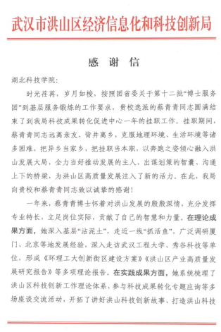 (通讯员:刘波;审稿人:吴乐盈)11月15日,武汉市洪山区经济信息化和科技创新局(以下简称“洪山区经科局”)一行7人在副局长刘功勋的带领下专程到我校经管学院,送来一封真挚的感谢信,以此表达对我校选派的团省委第十二批“博士服务团”蔡青青老师在挂职期间所做出的卓越贡献表示高度赞扬和衷心感谢。
