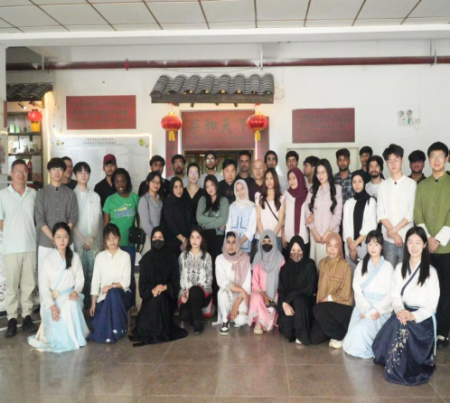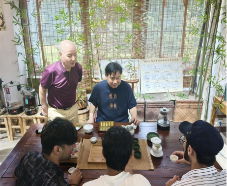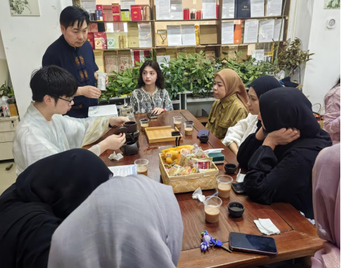 在品茗环节,中外学生在古琴、古筝、中阮、长笛和呜嘟悠扬的乐曲声中,共同品鉴了人类非物质文化遗产代表作绿茶(西湖龙井)、黄茶(君山银针)、白茶(福鼎白毫)、青茶(漳平水仙)、红茶(祁门红茶)、黑茶(赤壁青砖)等多种茶类,还观赏了宋代点茶演示以及“茶+”跨界创意赛作品,如巴基斯坦奶茶等。