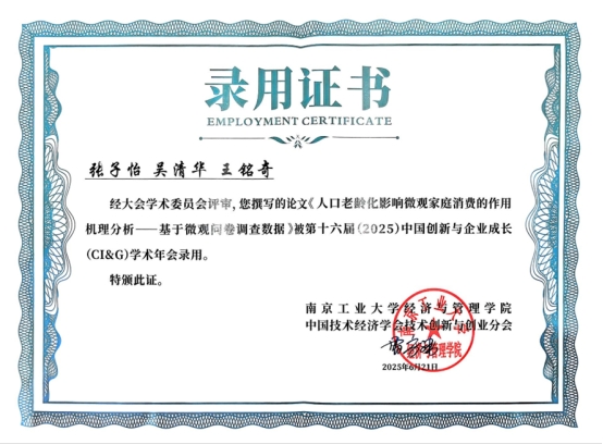 在本次年会投稿踊跃、遴选严格的论文评审中,我院吴清华博士指导、张子怡完成的学术论文《人口老龄化影响微观家庭消费的作用机理分析》脱颖而出,成功入选年会正式论文集。该研究聚焦我国人口结构转型的重大现实问题,创新性地运用微观家庭调查数据,深入剖析老龄化对居民消费行为的多层次影响机制,为理解“银发经济”潜力和制定相关应对政策,提供了有价值的微观证据和理论参考。
